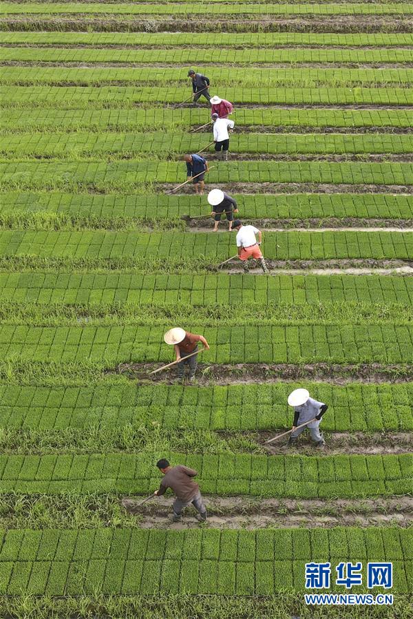 6月5日,在江苏省淮安市洪泽区三河镇,农民在水稻育秧田里除草(无人机照片)。 当日是芒种节气,各地农民抢抓农时忙碌在田间地头。 新华社发(万震 摄)
