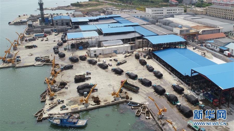 6月5日,在山东省荣成市寻山集团码头,满载海带的车辆排起了长龙(无人机照片)。新华社发(王福东 摄)