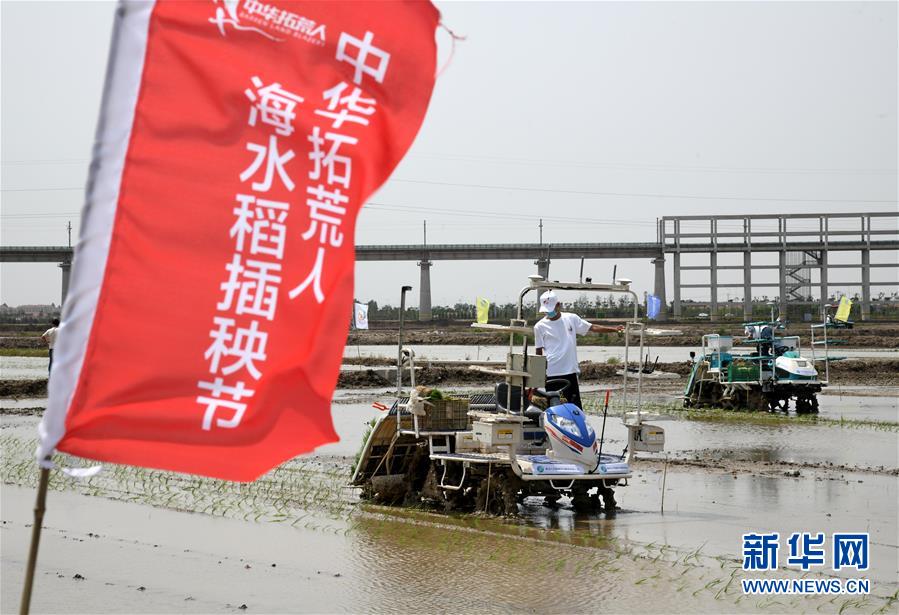 6月5日,在青岛城阳上马盐碱地稻作改良示范基地,插秧机在试验田里插秧。新华社记者 李紫恒 摄