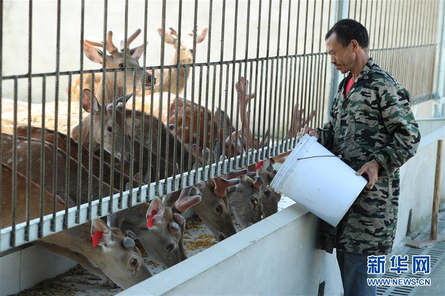 6月5日,村民在贵州省铜仁市江口县桃映镇小屯村梅花鹿养殖基地给梅花鹿喂食。 近年来,贵州省铜仁市江口县依托梅花鹿养殖产业,按照“龙头企业+合作社+农户”的经营模式,辐射带动两个农民专业合作社种植牧草580亩,让1000余名村民实现在家门口就业。2019年,该县桃映镇5个村入股梅花鹿养殖基地,人均年增收近3000元。 据了解,2017年11月以来,江口县建成占地55亩集养殖、加工为一体的梅花鹿养殖基地,养殖梅花鹿近600头。 新华社发(胡攀学 摄)