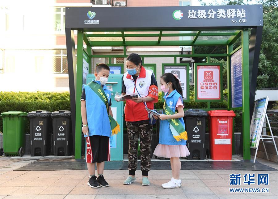 在北京市海淀区中关村街道新科祥园社区,社区工作人员(中)为“绿色明天”环保志愿小队队员李梦鸿一(右)、施柏涵介绍垃圾分类知识(5月31日摄)。新华社记者 任超 摄