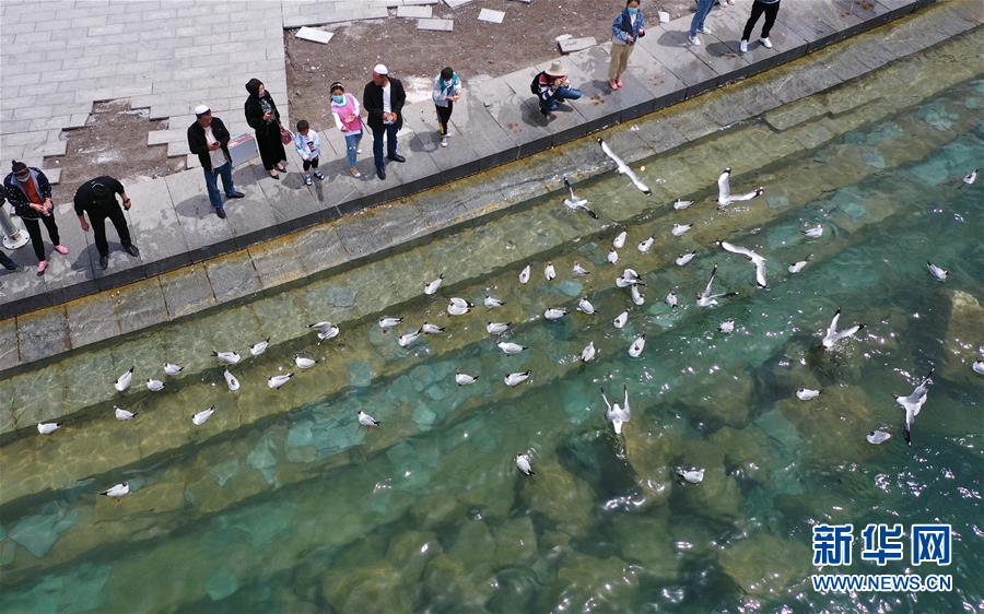 6月5日,游客在青海湖二郎剑景区观赏水鸟(无人机照片)。 夏日,青海湖碧波荡漾,风光怡人。 新华社记者韩方方摄