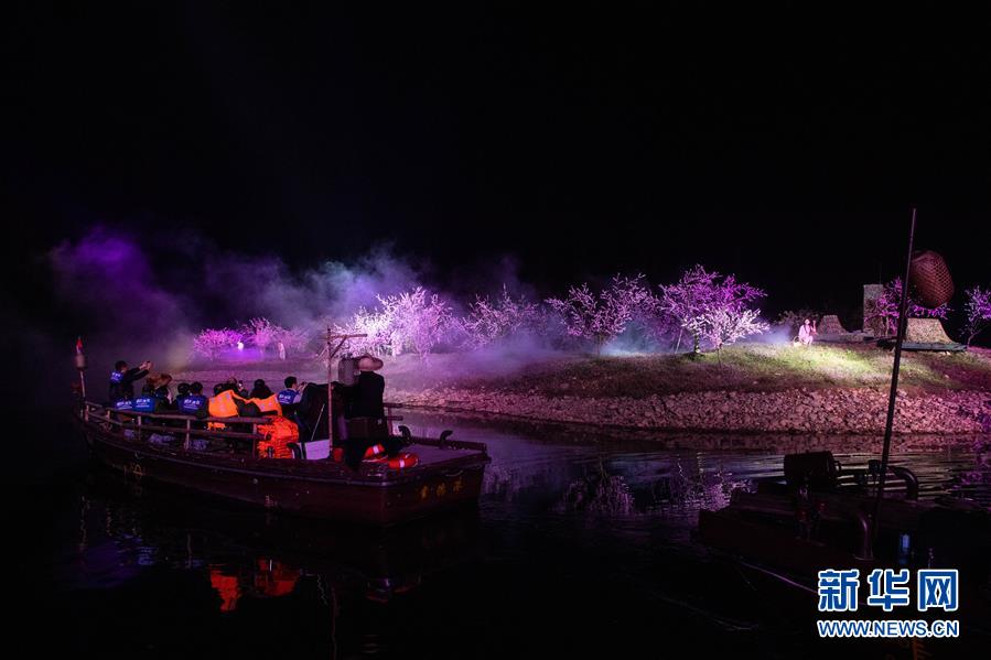 游客在湖南省常德市桃花源风景名胜区乘船观看实景演出《桃花源记》(2019年11月13日摄)。新华社发(陈思汗 摄)