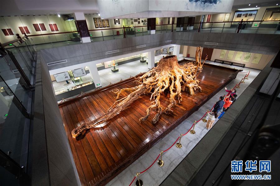 在湖南省常德市桃花源风景名胜区“桃源工”艺术博物馆,游客在观看岩柳根雕作品《桃花源》(2019年11月14日摄)。新华社发(陈思汗 摄)