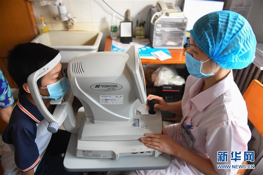 6月6日,在中南大学湘雅三医院,医务人员(右)在为小朋友做眼科检查。 当日是全国爱眼日,位于湖南省长沙市的中南大学湘雅三医院开展眼科义诊活动,为市民提供眼科义诊服务。 新华社记者 陈泽国 摄