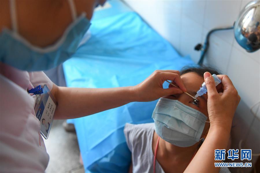 6月6日,在中南大学湘雅三医院,医务人员在给小朋友做眼科检查前滴眼药水。 当日是全国爱眼日,位于湖南省长沙市的中南大学湘雅三医院开展眼科义诊活动,为市民提供眼科义诊服务。 新华社记者 陈泽国 摄