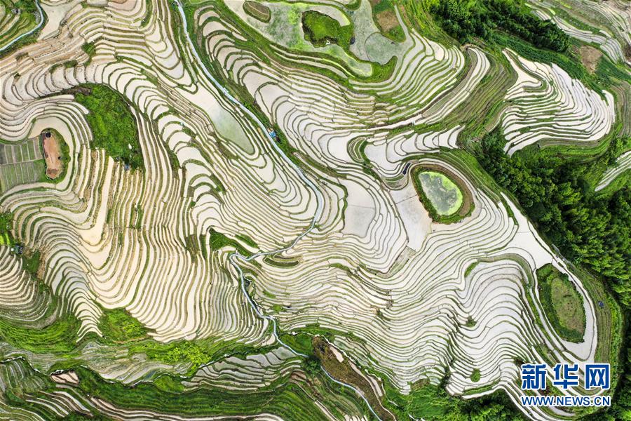这是广西龙胜各族自治县龙脊梯田风光(6月4日摄,无人机照片)。 初夏时节,广西龙胜各族自治县龙脊梯田景区内2000多亩梯田层层叠叠,与周边村寨、吊脚楼等融为一体,景色迷人。 新华社记者 曹祎铭 摄