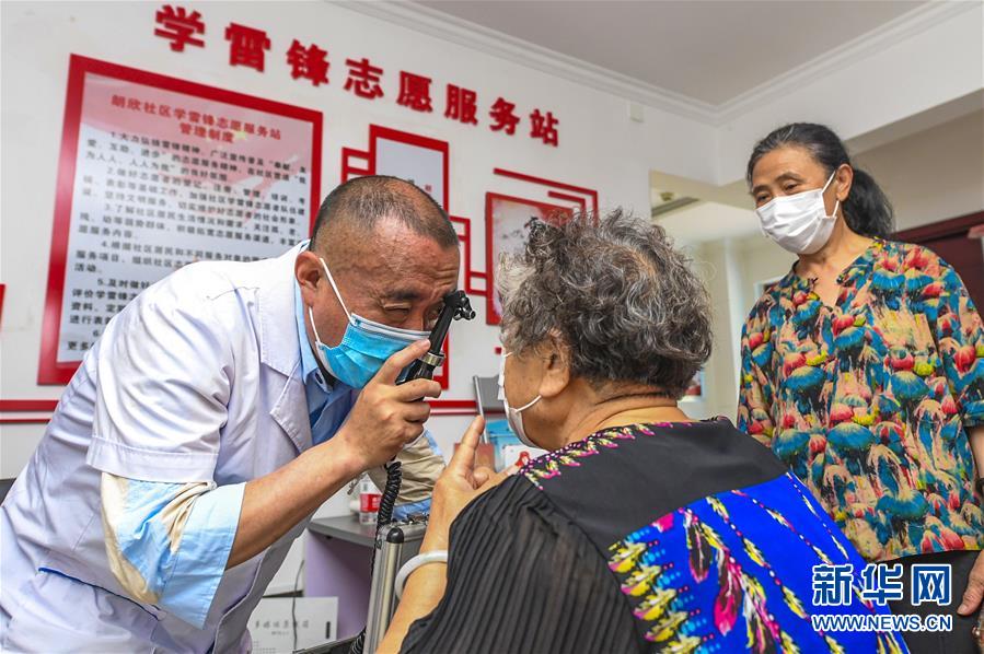 6月6日,在河北省廊坊市广阳区朗欣社区,广阳区眼科医院医生利用裂隙灯为居民进行眼部检查。 当日是全国爱眼日,河北省廊坊市广阳区眼科医院以“视觉2020 关注普遍的眼健康”为活动主题,走进社区举办义诊活动。 新华社记者李晓果摄