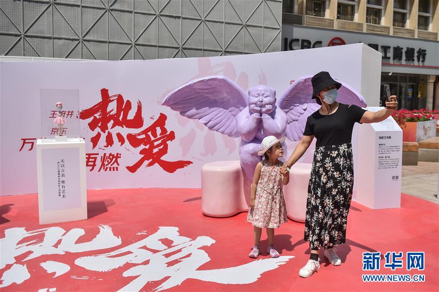 6月6日,一位女士带着孩子在王府井大街活动现场的展览区拍照留念。 当日,北京消费季正式开启,进一步推动北京各行业复商复市,加快实现消费回暖。 新华社记者 彭子洋 摄