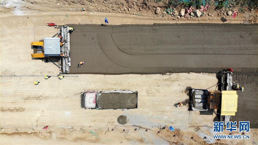 6月6日,工人在济泰高速工地上施工(无人机照片)。 济南至泰安高速公路是山东省高速公路规划网的“纵六”并行线,目前该工程进入最后冲刺阶段,各施工单位正加紧施工,确保2020年年内建成通车。高速建成后,从济南至泰安只需半小时左右。 新华社记者 王凯 摄