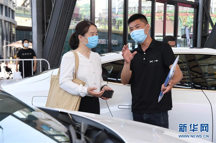 6月6日,在北京华熙LIVE·五棵松商业街区举办的“北京消费季之悦动海淀”活动现场,工作人员(右)向市民介绍一款汽车的配置。 当日,北京消费季正式开启,进一步推动北京各行业复商复市,加快实现消费回暖。 新华社记者 任超 摄