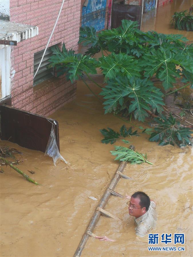 6月6日,利周瑶族乡乡长陆富双冒着洪水前往敬老院营救被困老人。新华社发(田林县融媒体中心供图)