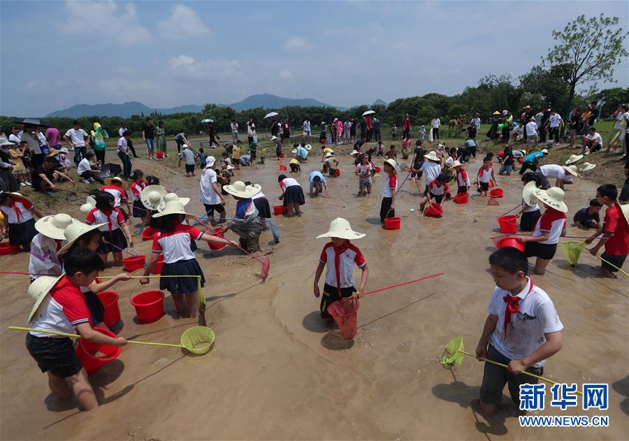 6月7日,孩子和家长们参加浑水摸鱼趣味活动。新华社记者 徐昱 摄