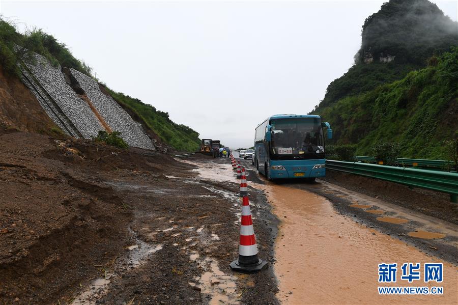 6月7日,在广西鹿寨至阳朔的高速公路上,车辆从一处发生滑坡的路段经过。新华社记者 陆波岸 摄