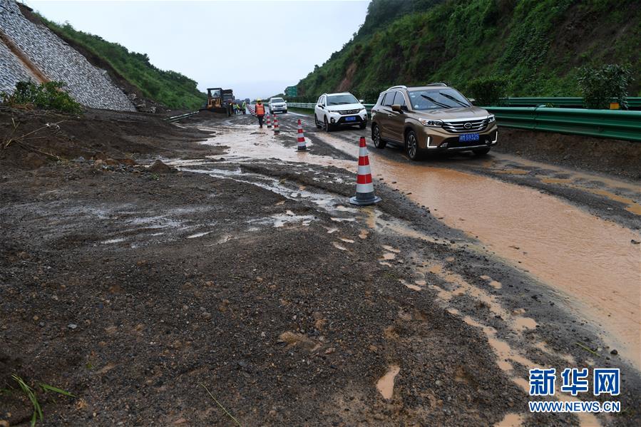 6月7日,在广西鹿寨至阳朔的高速公路上,车辆从一处发生滑坡的路段经过。 新华社记者 陆波岸 摄