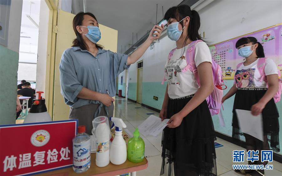 6月8日,在河北省大厂回族自治县城区第二小学,老师在对返校学生进行体温复检。 当日,河北省小学四、五年级返校复课。 新华社记者李晓果摄