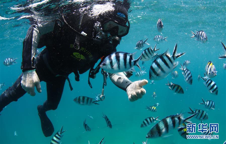 在海南三亚蜈支洲岛海域,旅游区工作人员即将下潜到海洋牧场进行作业(4月27日摄)。 新华社记者 杨冠宇 摄