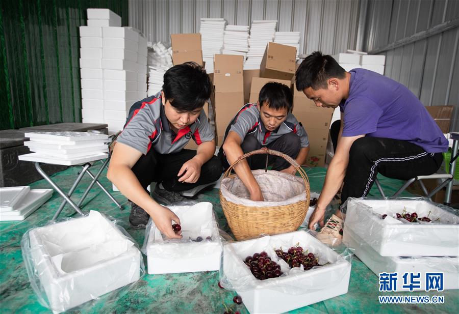 6月8日,在汉源县九襄镇水果批发市场,果农黄智良在快递点给电商平台购买甜樱桃的客户发货。新华社记者 江宏景 摄