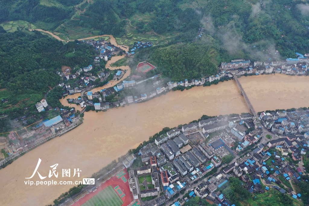 受上游持续强降雨影响,2020年6月8日上午11时,都柳江洪峰过境贵州省从江县城,洪峰流量约7200m?/s,水位188.4m,超警戒水位0.90m(警戒水位187.50m)。12时水位下降至187.46m。从江县城区部分沿江低洼地带被洪水淹没。目前,都柳江水位正在缓慢下降。吴德军/人民图片