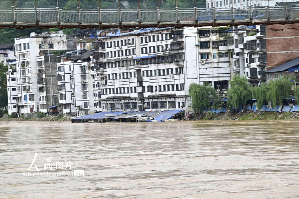 受上游持续强降雨影响,2020年6月8日上午11时,都柳江洪峰过境贵州省从江县城,洪峰流量约7200m?/s,水位188.4m,超警戒水位0.90m(警戒水位187.50m)。12时水位下降至187.46m。从江县城区部分沿江低洼地带被洪水淹没。目前,都柳江水位正在缓慢下降。吴德军/人民图片