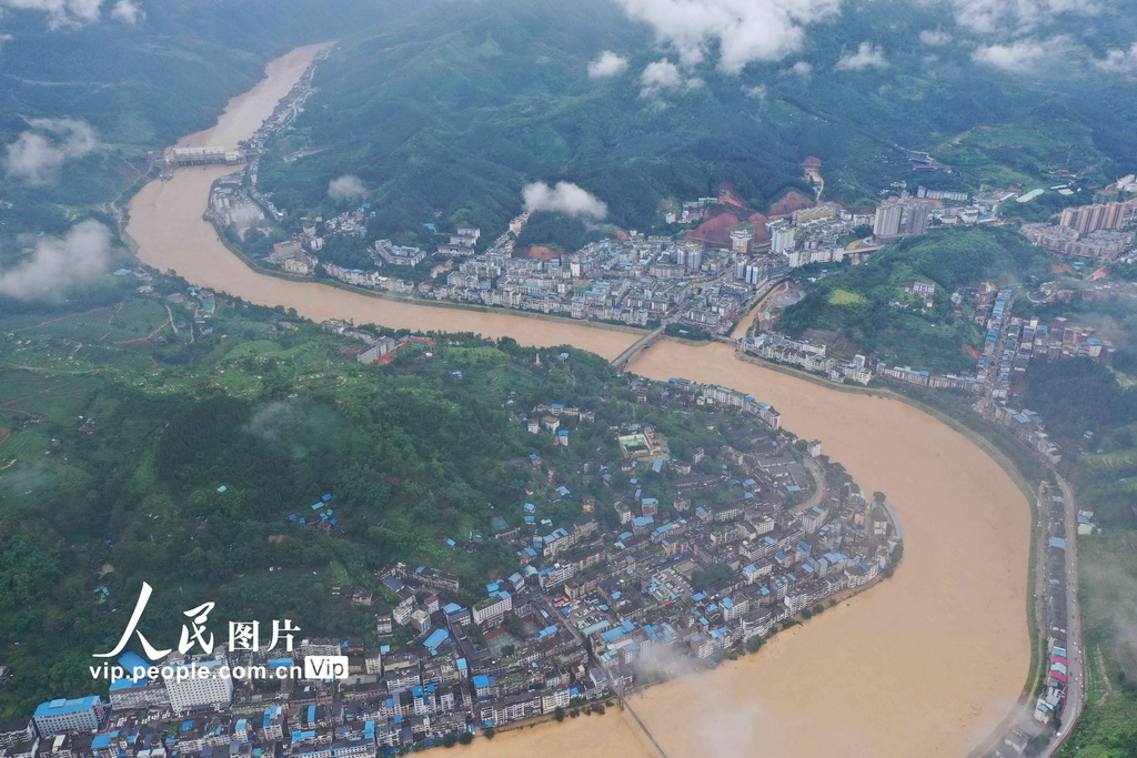 受上游持续强降雨影响,2020年6月8日上午11时,都柳江洪峰过境贵州省从江县城,洪峰流量约7200m?/s,水位188.4m,超警戒水位0.90m(警戒水位187.50m)。12时水位下降至187.46m。从江县城区部分沿江低洼地带被洪水淹没。目前,都柳江水位正在缓慢下降。吴德军/人民图片