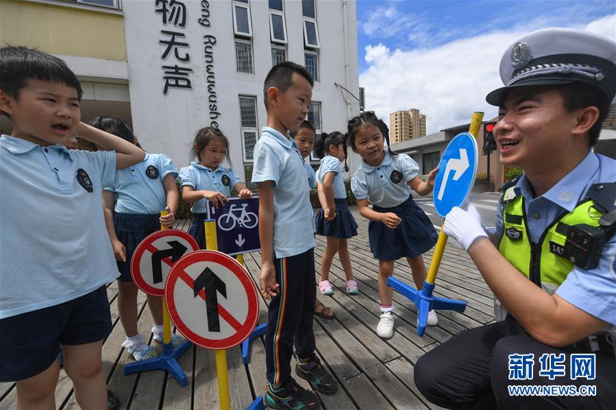 6月9日,交警在校园内给孩子们讲解各类交通标志的含义。 当日,浙江省新昌县公安局交警大队民警在新昌幼儿园举行“小手拉大手 文明出行进校园”活动,通过道路模拟出行、公交站模拟等车、学做小交警、考取“幼儿园模拟驾驶证”等活动,对师生开展交通安全培训,倡导大家文明安全出行。 新华社记者 徐昱 摄