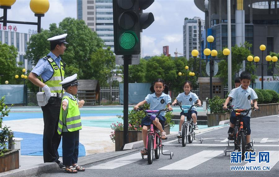 6月9日,孩子们在交警的指导下,在校园“交通安全模拟公路”上学习道路安全出行。 当日,浙江省新昌县公安局交警大队民警在新昌幼儿园举行“小手拉大手 文明出行进校园”活动,通过道路模拟出行、公交站模拟等车、学做小交警、考取“幼儿园模拟驾驶证”等活动,对师生开展交通安全培训,倡导大家文明安全出行。 新华社记者 徐昱 摄