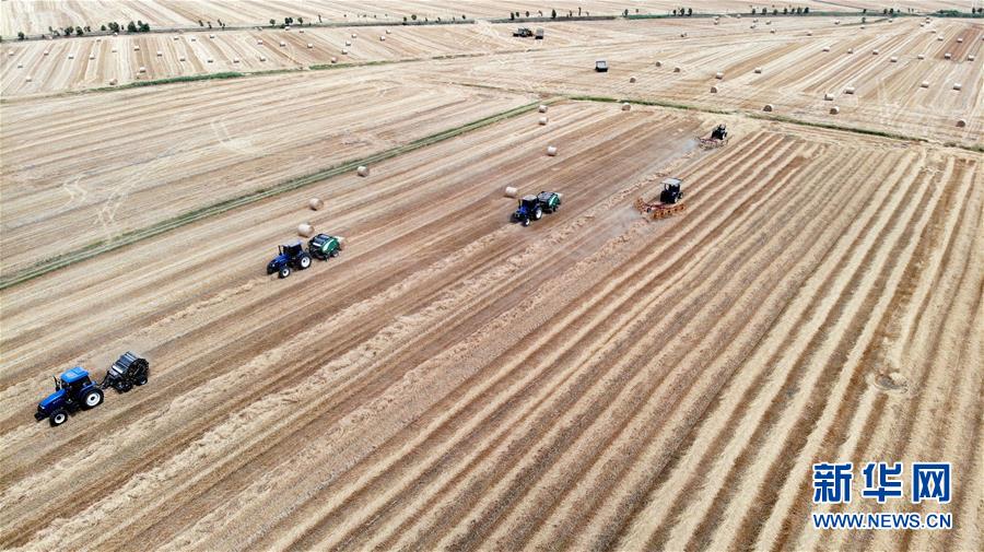 6月9日,在安徽省五河县新集镇姚管村,农民驾驶小麦秸秆打捆机在田间作业(无人机照片)。新华社发(黄博涵摄)