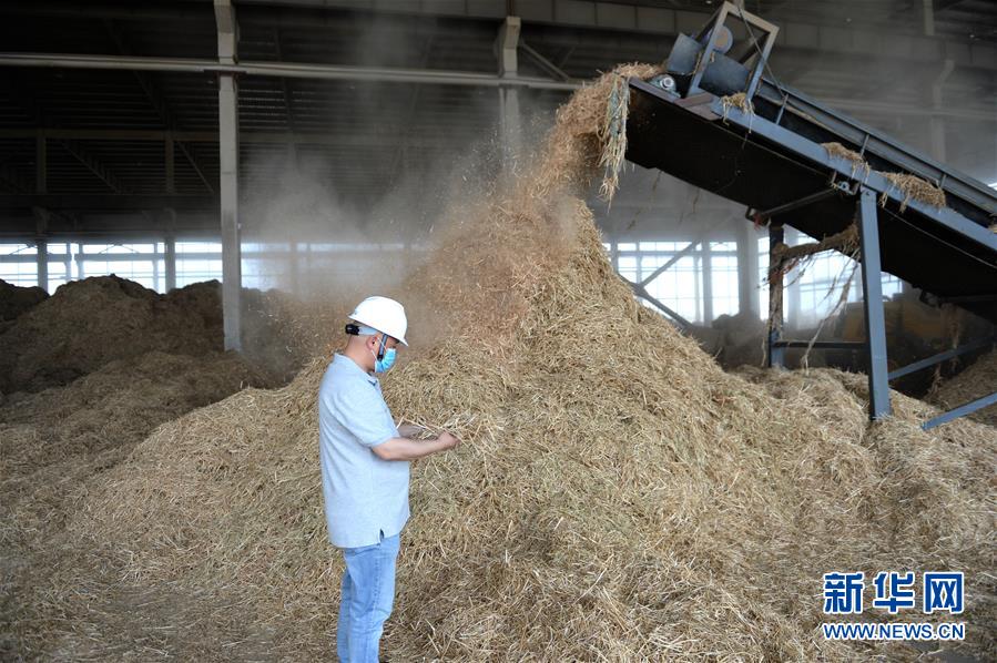 6月9日,在上海电气(五河)生物质热电有限公司,工作人员查看小麦秸秆的粉碎效果。新华社发(黄博涵摄)