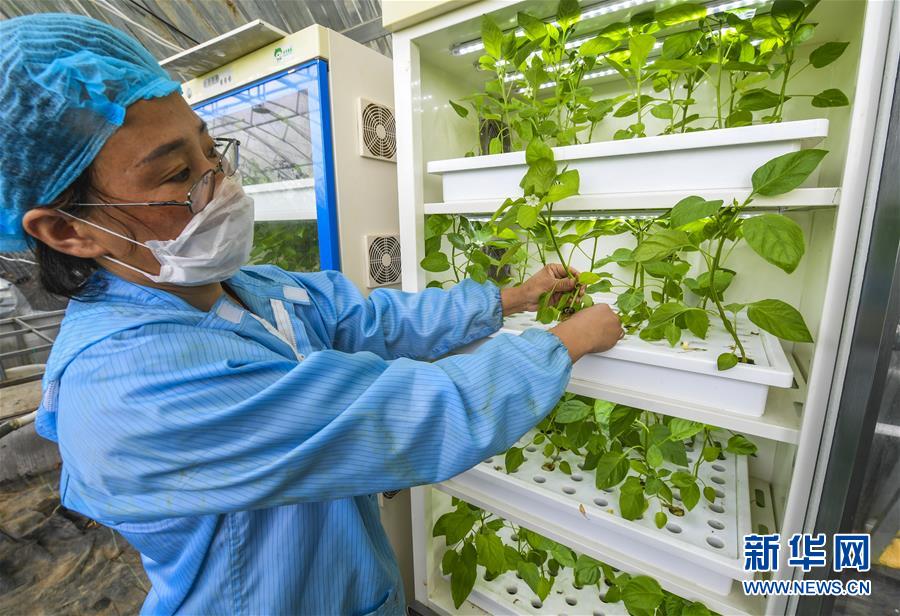 6月10日,在安头屯镇设施农业基地,技术人员将蔬菜苗放入培育箱。新华社记者 李晓果摄