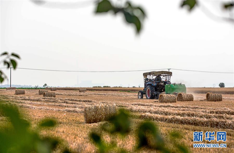 6月10日,在大同镇马会村,农民驾驶小麦秸秆打捆机在麦田作业。新华社记者 王晓 摄