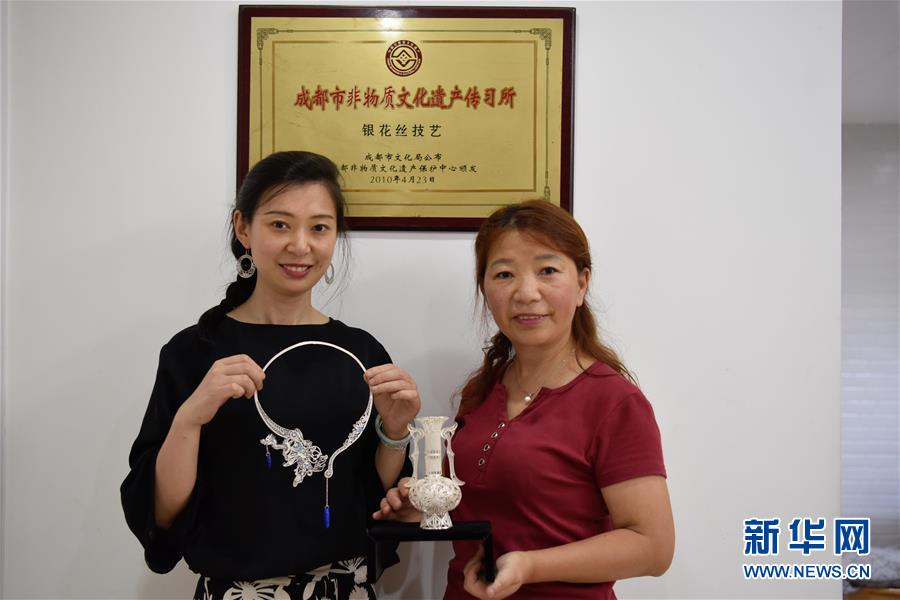 6月10日,在道安银花丝工作室,道安(右)和女儿王晓璐展示各自的作品。