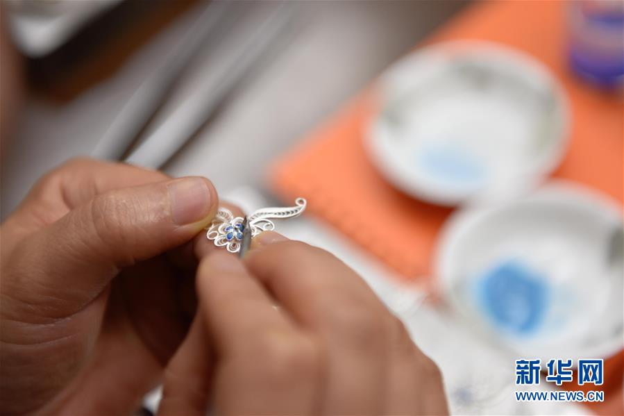 6月10日,在道安银花丝工作室,匠人在进行珐琅工序,为银花丝上色。新华社发(胥冰洁摄)
