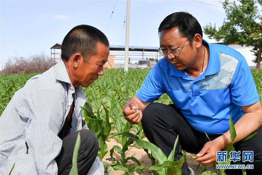6月10日,杭锦旗“农牧民夜校”讲师团团长王国军(右)在巴拉贡镇朝凯村向村民讲授病虫害防治办法。新华社发(贝赫 摄)