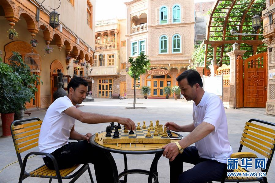 5月26日,两名商户在新疆和田市“团城”的鸽子巷下棋。新华社记者沙达提摄