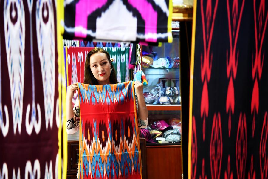 5月26日,在新疆和田市“团城”的鸽子巷吉亚丝绸艾德莱斯店,一名妇女在挑选商品。新华社记者沙达提摄