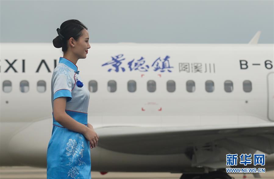 6月10日,在江西景德镇罗家机场,空乘人员在“景德镇”号ARJ21客机旁。 当日,江西航空引进的第二架国产支线飞机ARJ21在上海浦东机场交付后飞抵景德镇罗家机场,并正式冠名“景德镇”号。 新华社记者 周密 摄