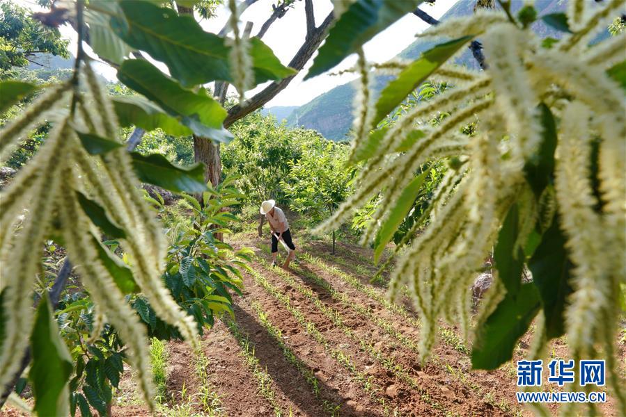 6月10日,河北省迁安市大五里乡农民在板栗林中打理套种的农作物。 近日,河北省迁安市栗花进入盛花期。迁安市板栗栽培历史悠久,现有种植面积11万亩,是带动当地农民增收的特色产业。 新华社记者 牟宇 摄