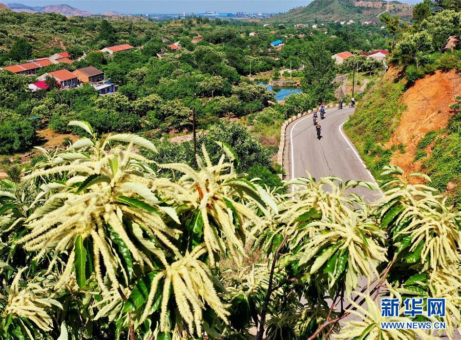 6月10日,骑行爱好者在河北省迁安市大五里乡板栗林里骑行(无人机照片)。 近日,河北省迁安市栗花进入盛花期。迁安市板栗栽培历史悠久,现有种植面积11万亩,是带动当地农民增收的特色产业。 新华社记者 牟宇 摄