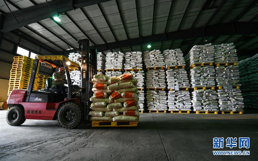 6月10日,在成都粮食集团青白江国家粮食储备库,工人驾驶叉车运送粮食。 新华社记者 王曦 摄