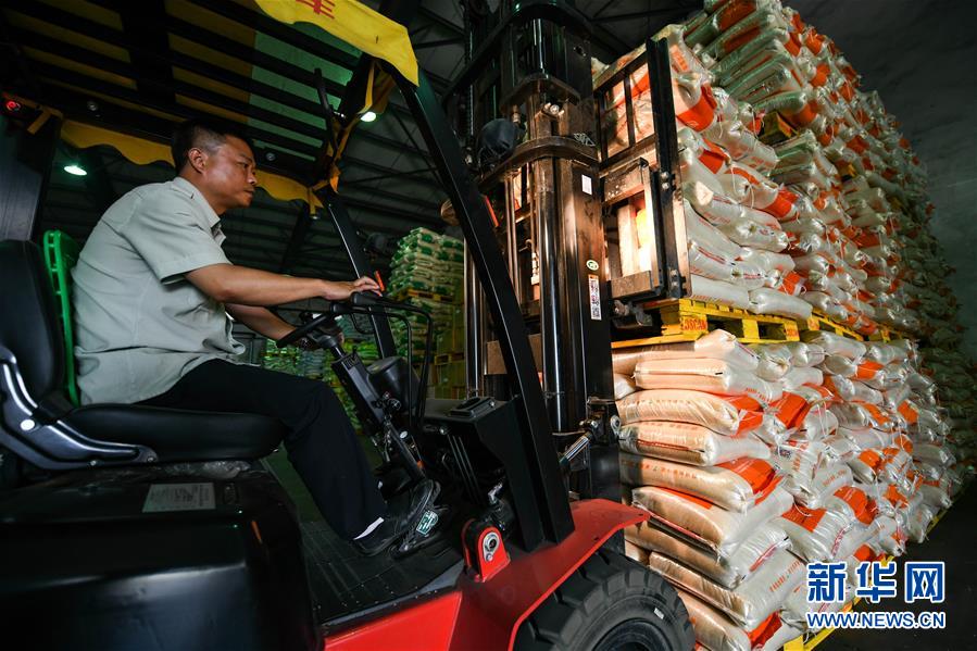 6月10日,在成都粮食集团青白江国家粮食储备库,工人驾驶叉车运送粮食。 新华社记者 王曦 摄