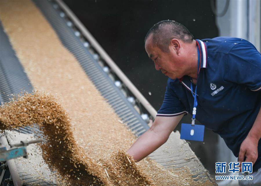 6月10日,在成都粮食集团青白江国家粮食储备库,粮食保管员在查看入库粮食的质量情况。 新华社记者 王曦 摄