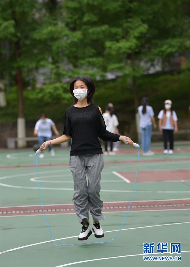 6月10日,恩施职业技术学院参加技能高考的学生在跳绳。 2020年高考临近,湖北省恩施职业技术学院参加技能高考的学生在备考之余开展快乐减压活动,以轻松乐观的心态迎接高考。 新华社发(杨顺丕 摄)