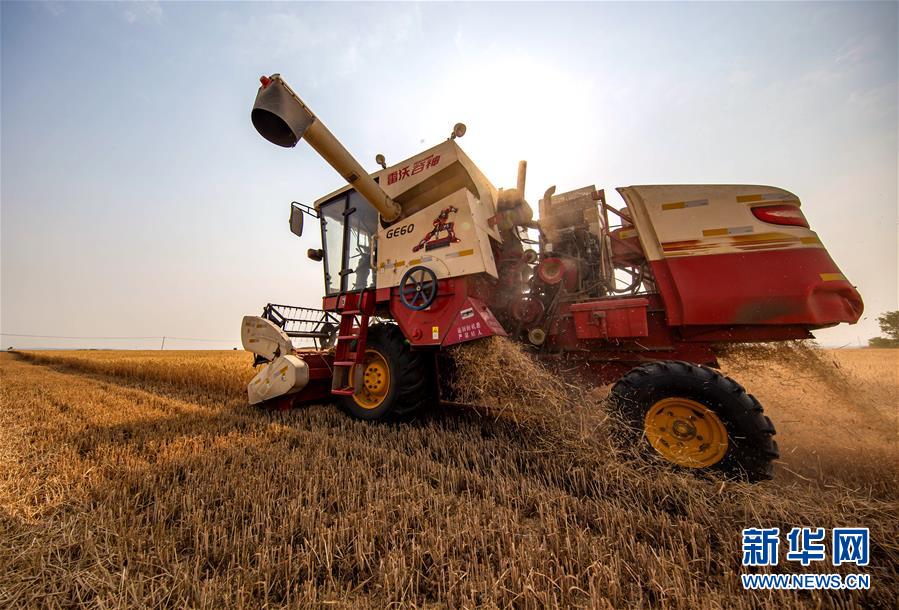 6月10日,在河北省武安市大同镇马会村,农机手操作机械设备收割小麦。 “三夏”时节,华北平原麦田满目金黄,麦收工作进入高峰期。农民抓住天气晴好的有利时机抢收小麦,确保颗粒归仓。 新华社记者 王晓 摄