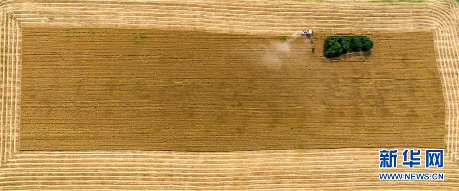 6月10日,在河北省武安市大同镇马会村,农机手操作机械设备收割小麦(无人机照片)。 “三夏”时节,华北平原麦田满目金黄,麦收工作进入高峰期。农民抓住天气晴好的有利时机抢收小麦,确保颗粒归仓。 新华社记者 王晓 摄