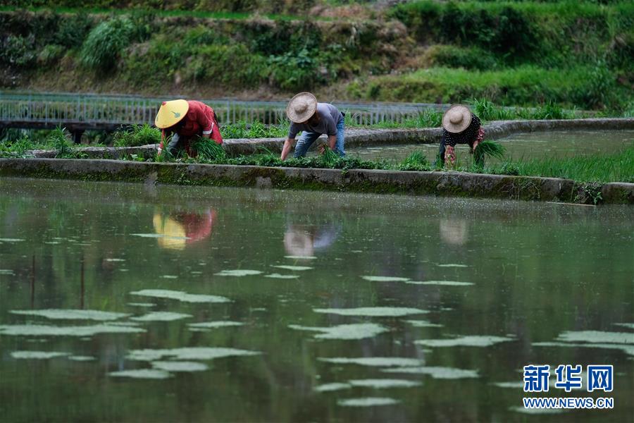 6月11日,小舟山乡的农民在高山梯田里插秧。新华社记者 徐昱 摄
