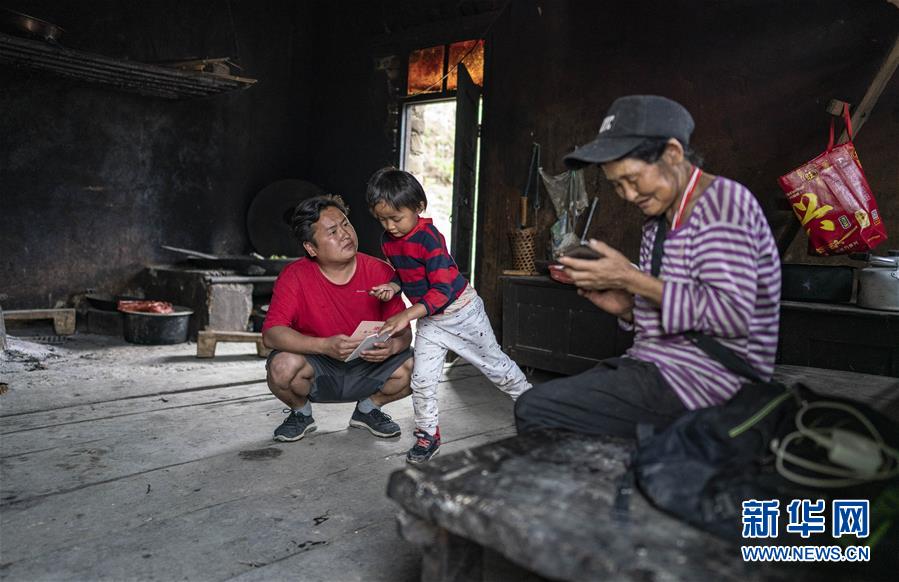 村委会主任王小波回山上的家中看望母亲和女儿(4月16日摄)。新华社记者江文耀摄