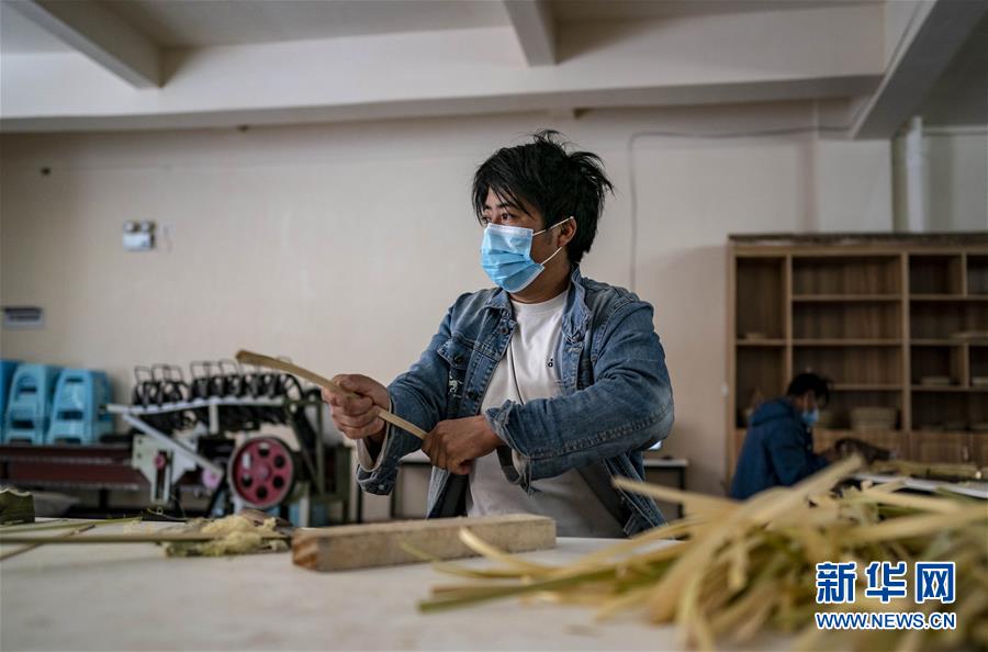 村民李小波在山下的扶贫车间学习竹编(4月15日摄)。新华社记者江文耀摄