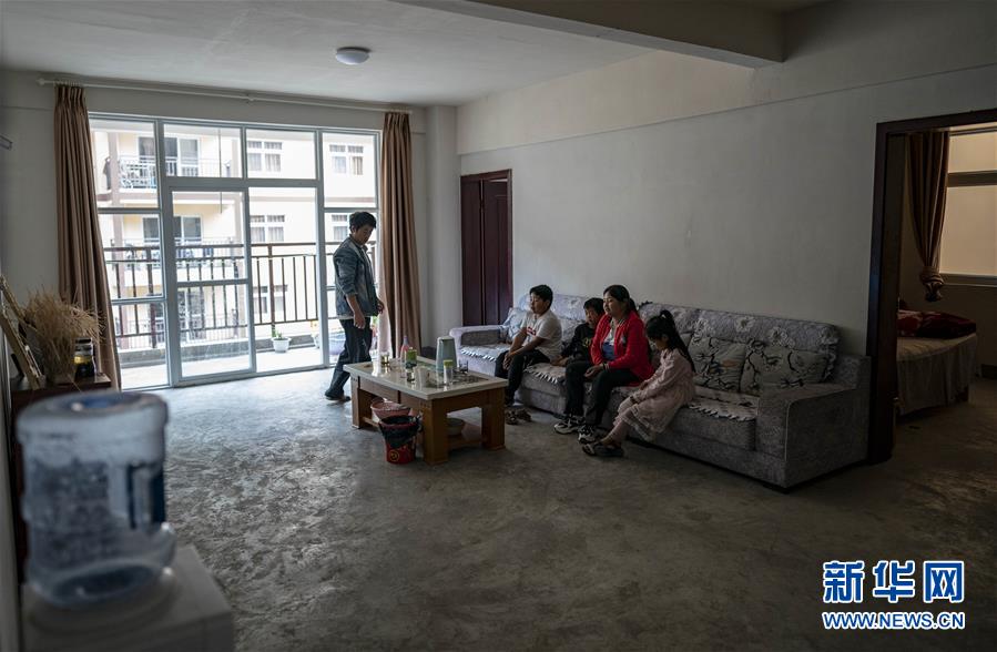 村民李小波一家在托坪村五湖易地扶贫搬迁安置点的家中休息(4月15日摄)。新华社记者江文耀摄