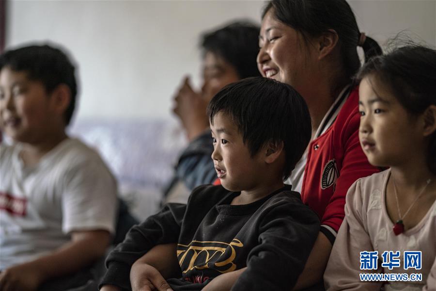 村民李小波的妻子阿花妹在托坪村五湖易地扶贫搬迁安置点的家中与孩子们一起看电视(4月15日摄)。新华社记者江文耀摄